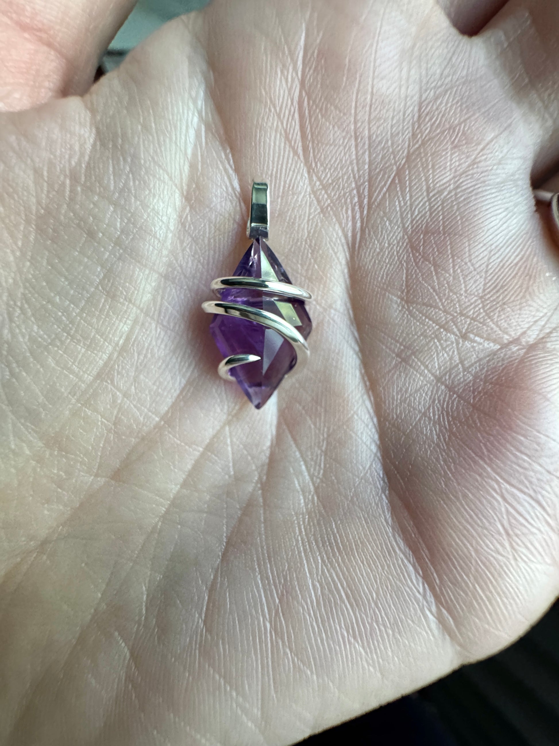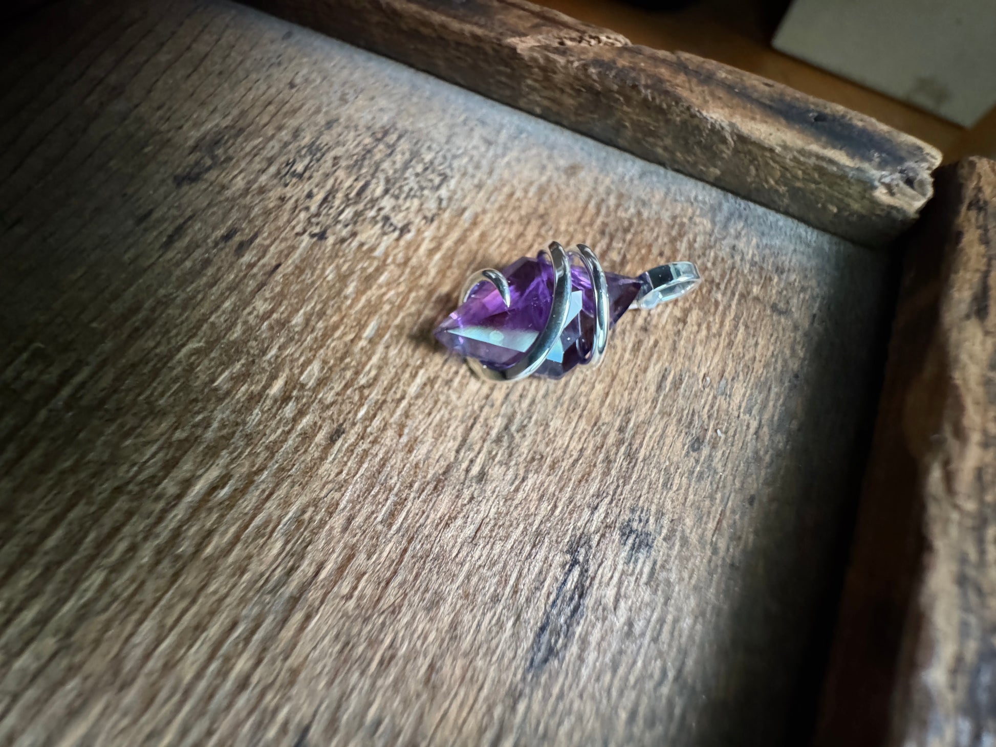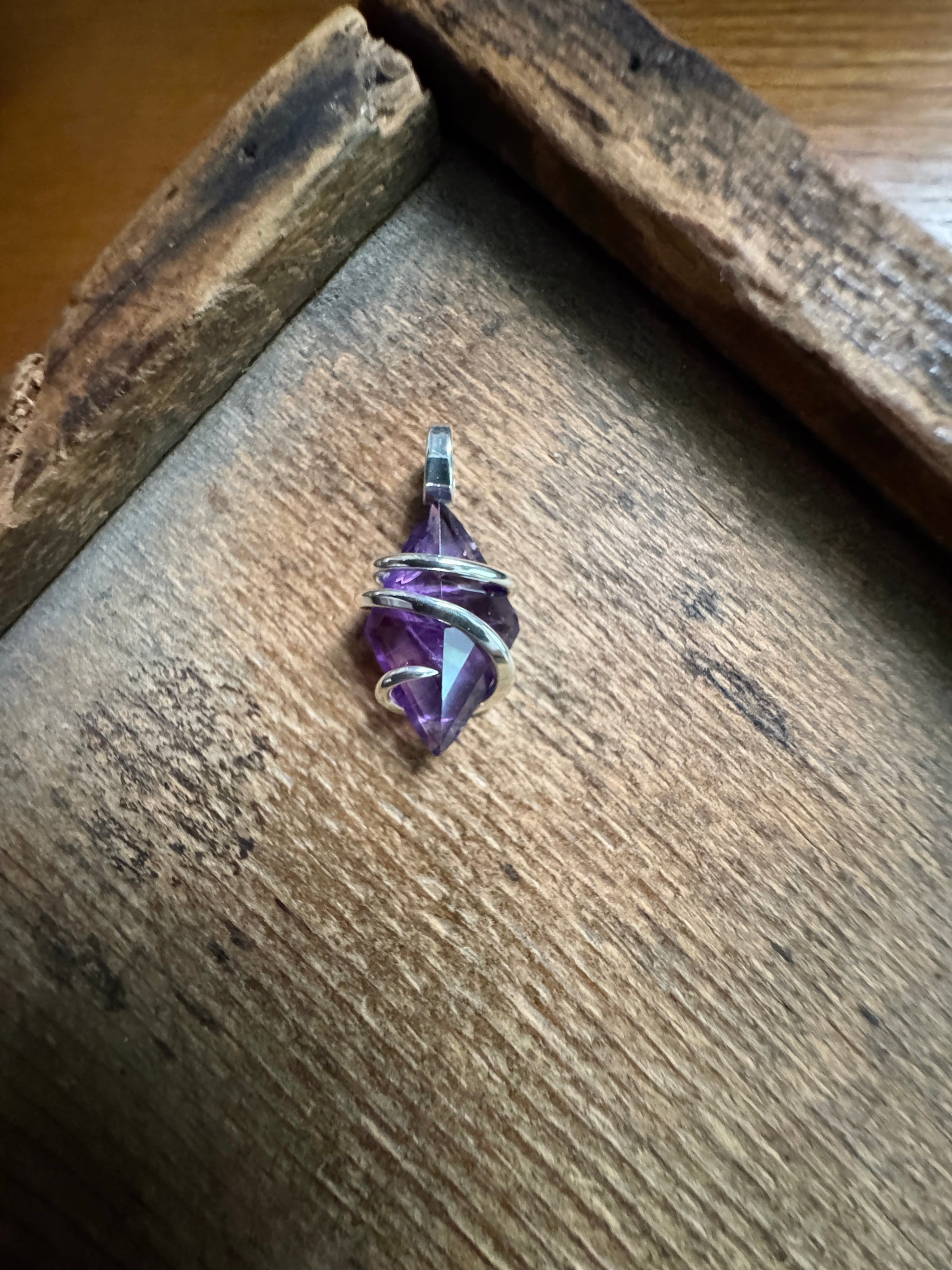 Beautiful faceted amethyst, artfully tension set in polished sterling silver pendant.