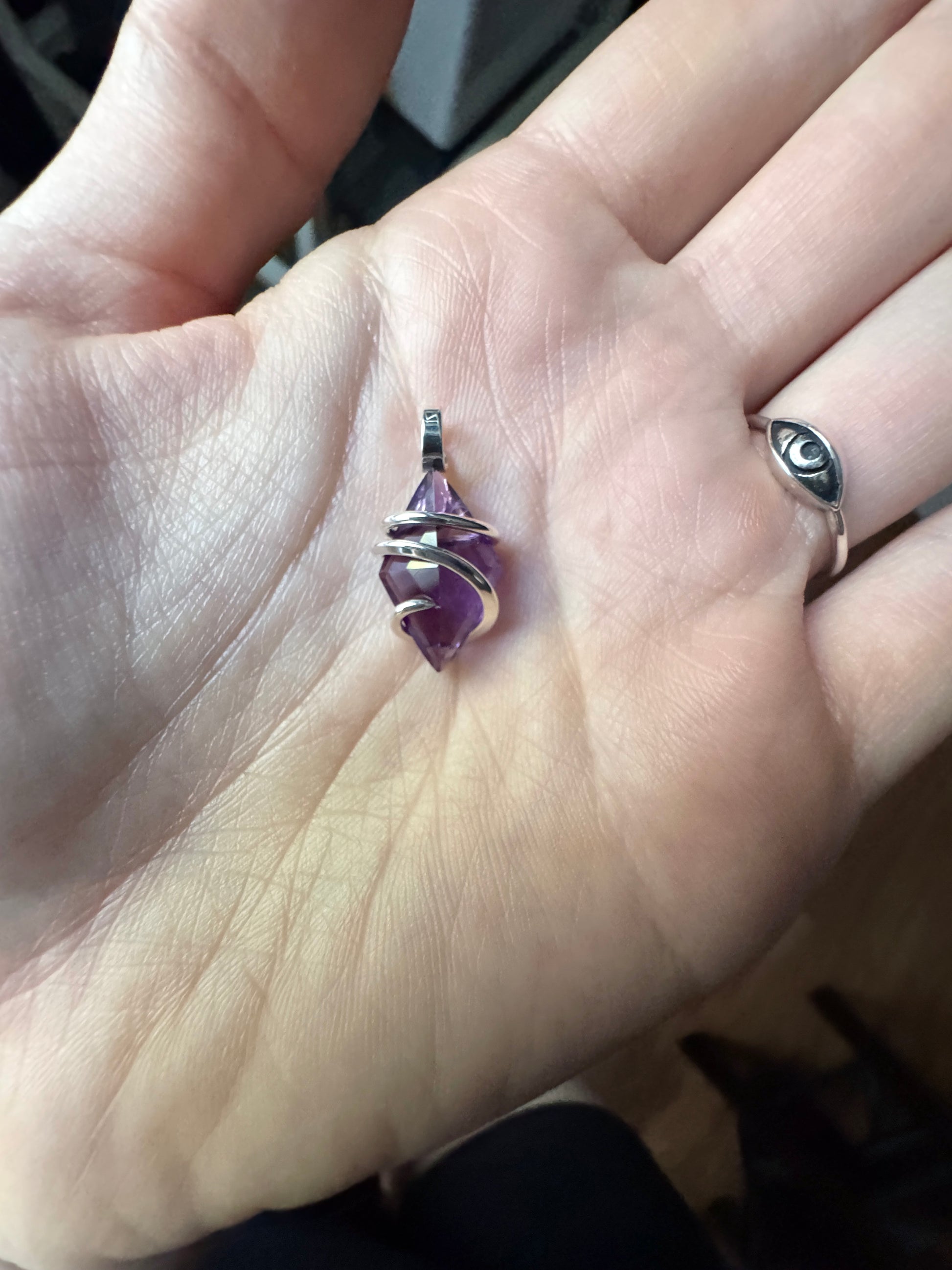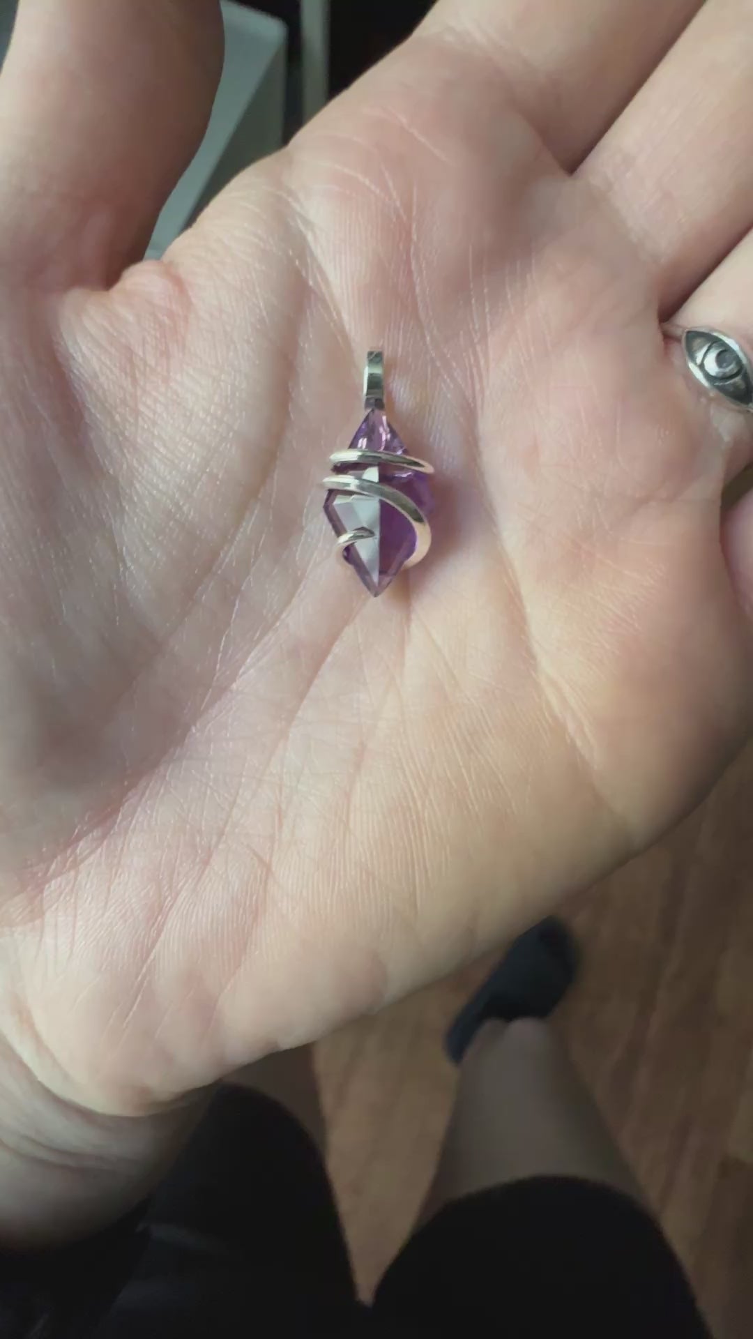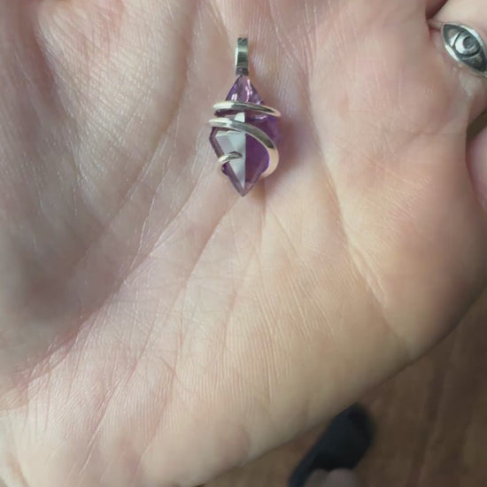 Beautiful faceted amethyst, artfully tension set in polished sterling silver pendant.