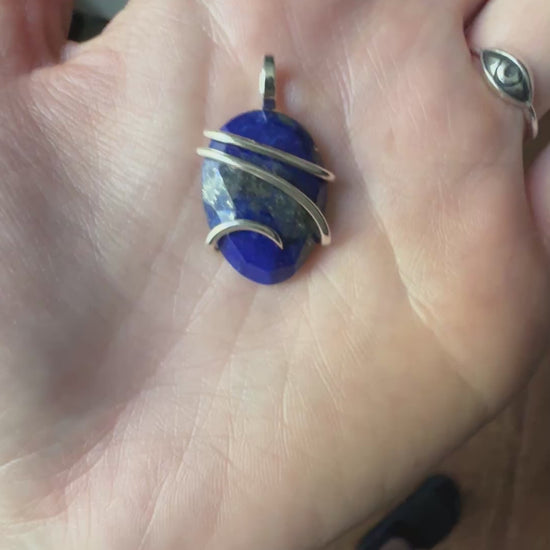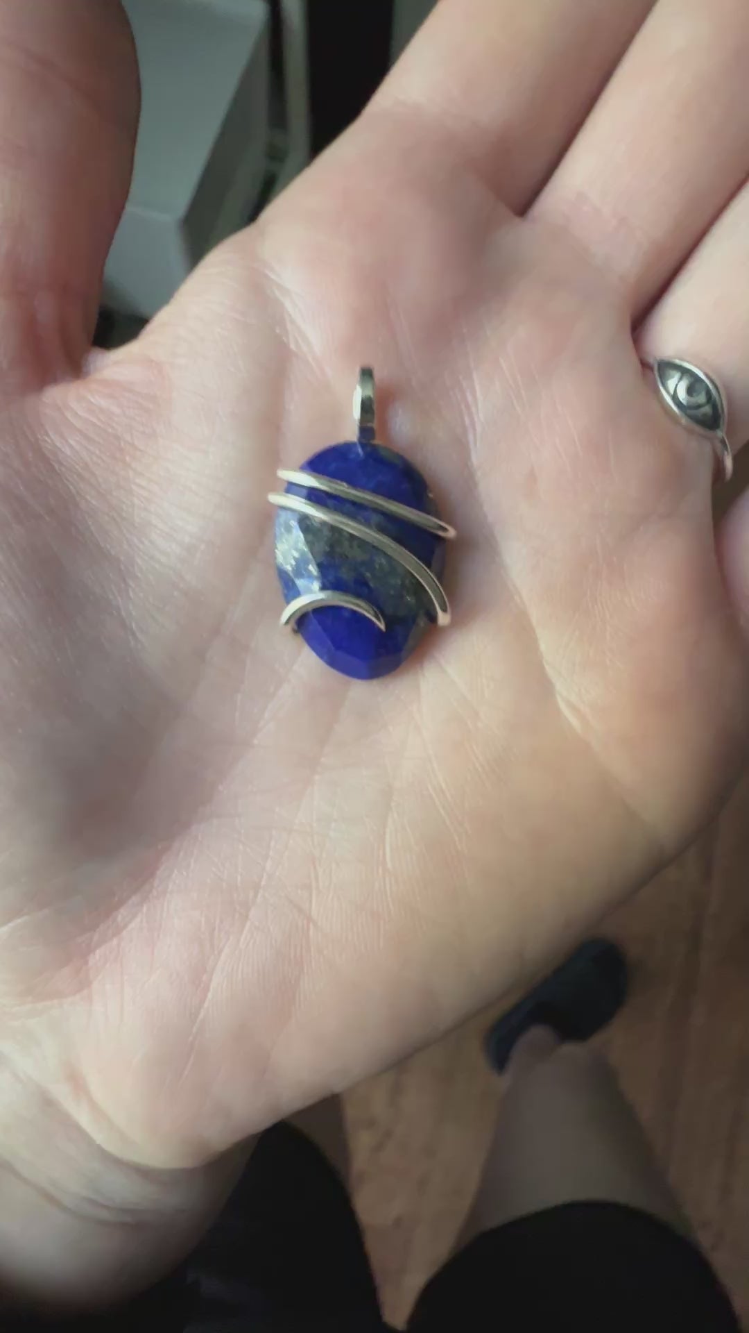 Beautiful faceted lapis cabochon, artfully tension set in polished sterling silver pendant.