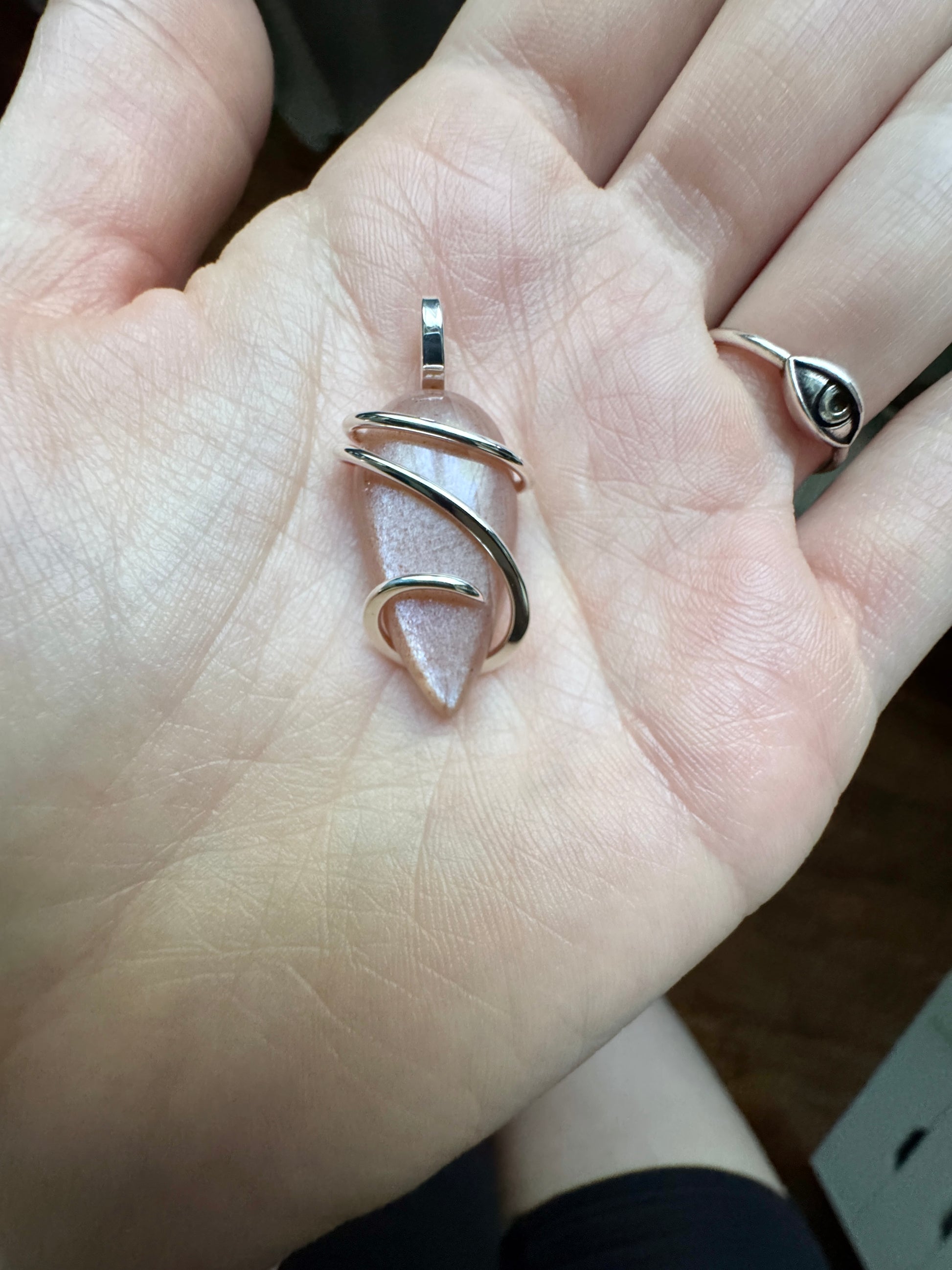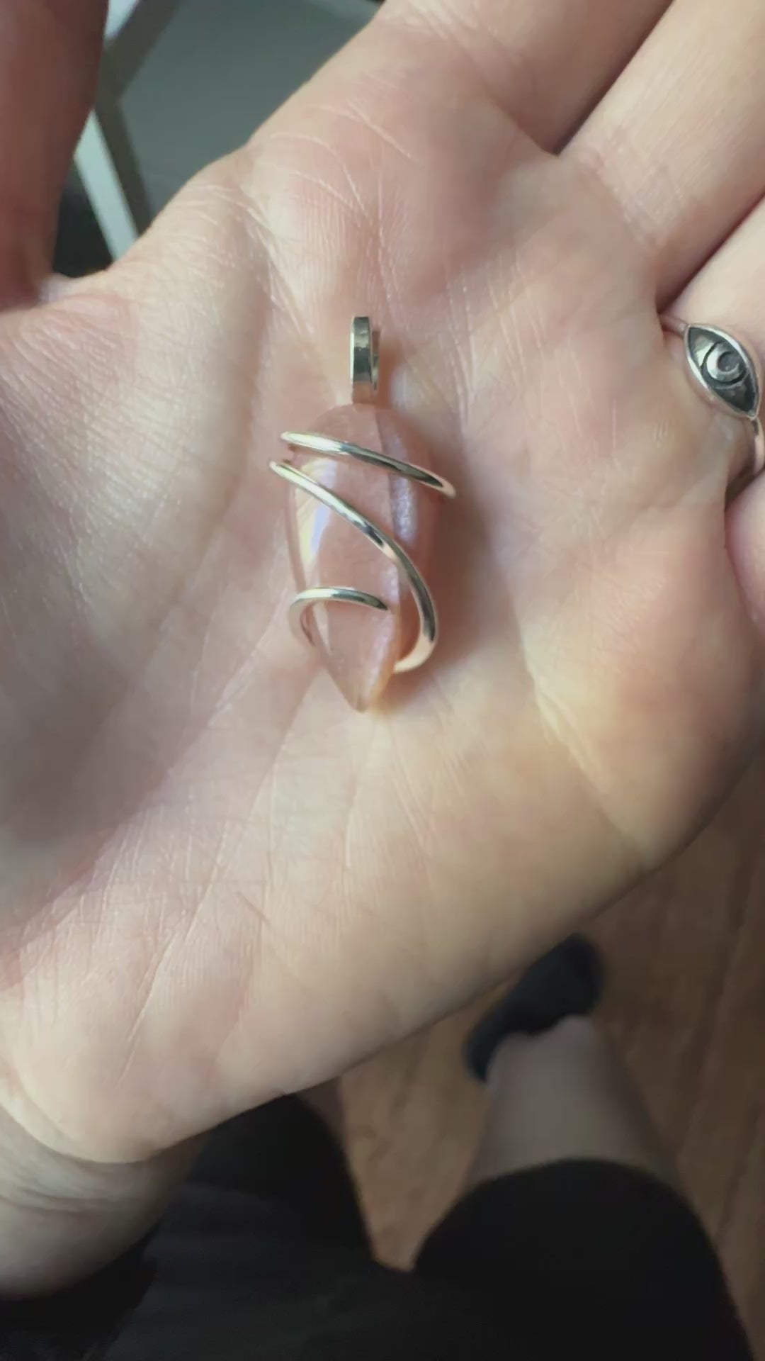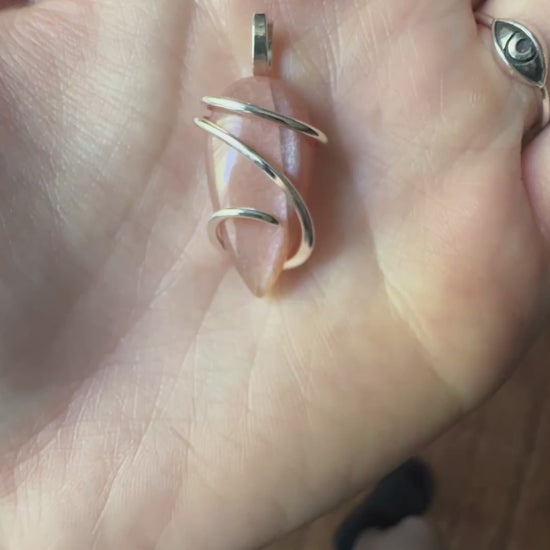 Polished peach moonstone cabochon, artfully tension set in polished sterling silver pendant.
