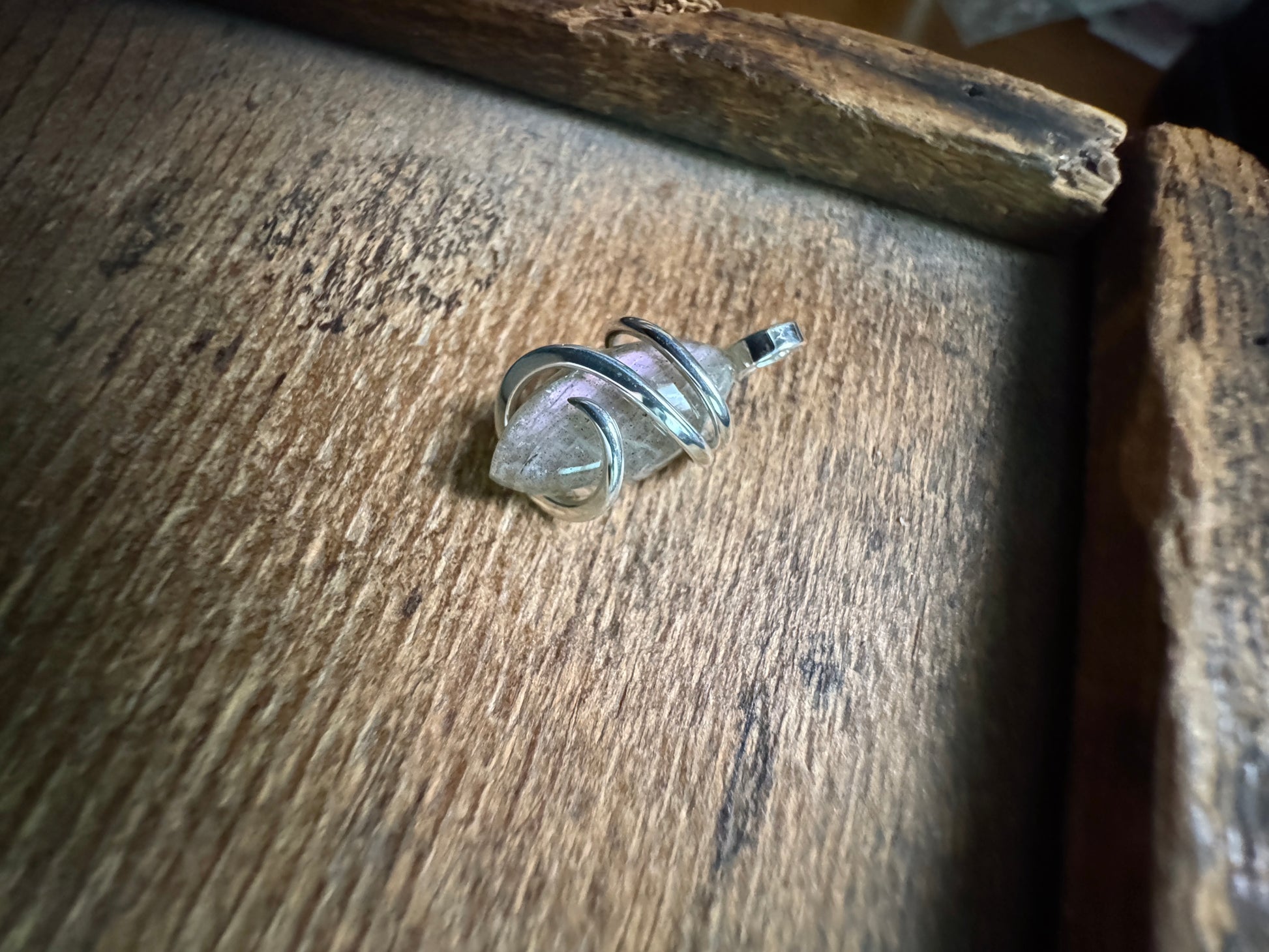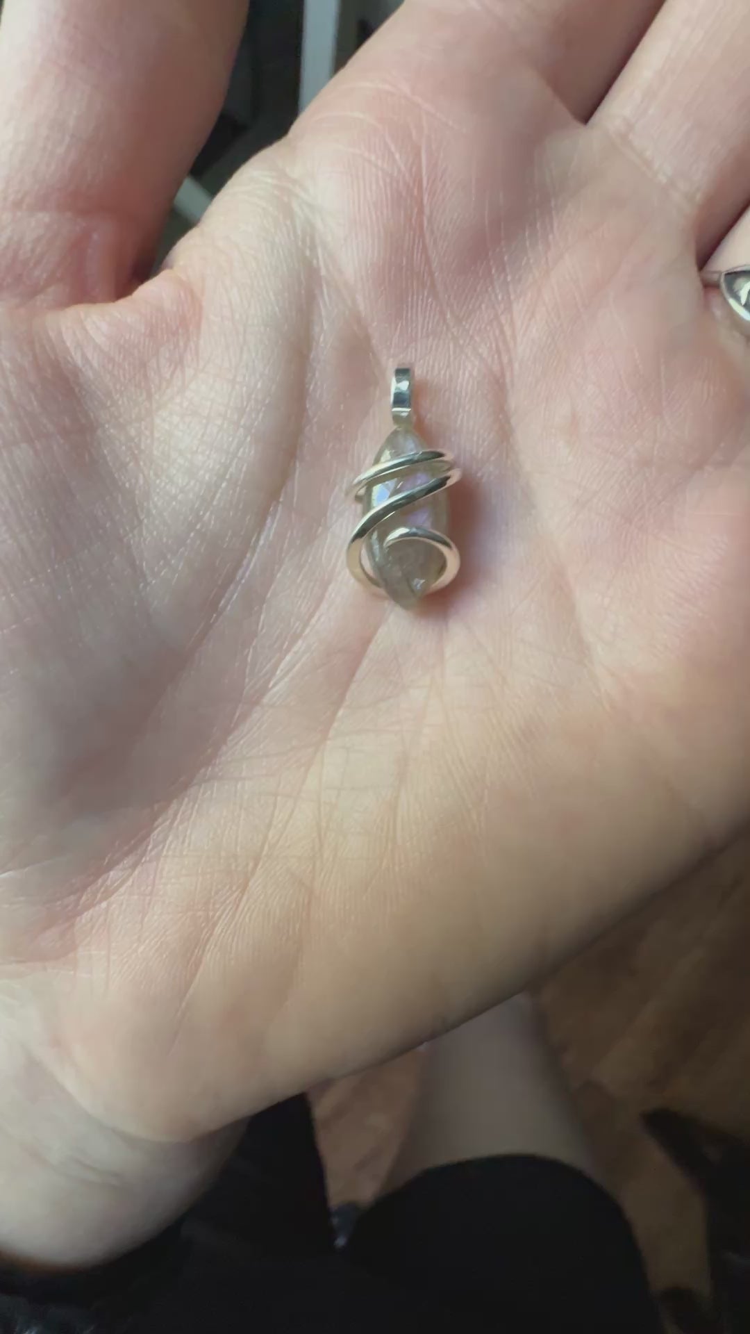 Beautiful polished pink labradorite cabochon, artfully tension set in polished sterling silver pendant.